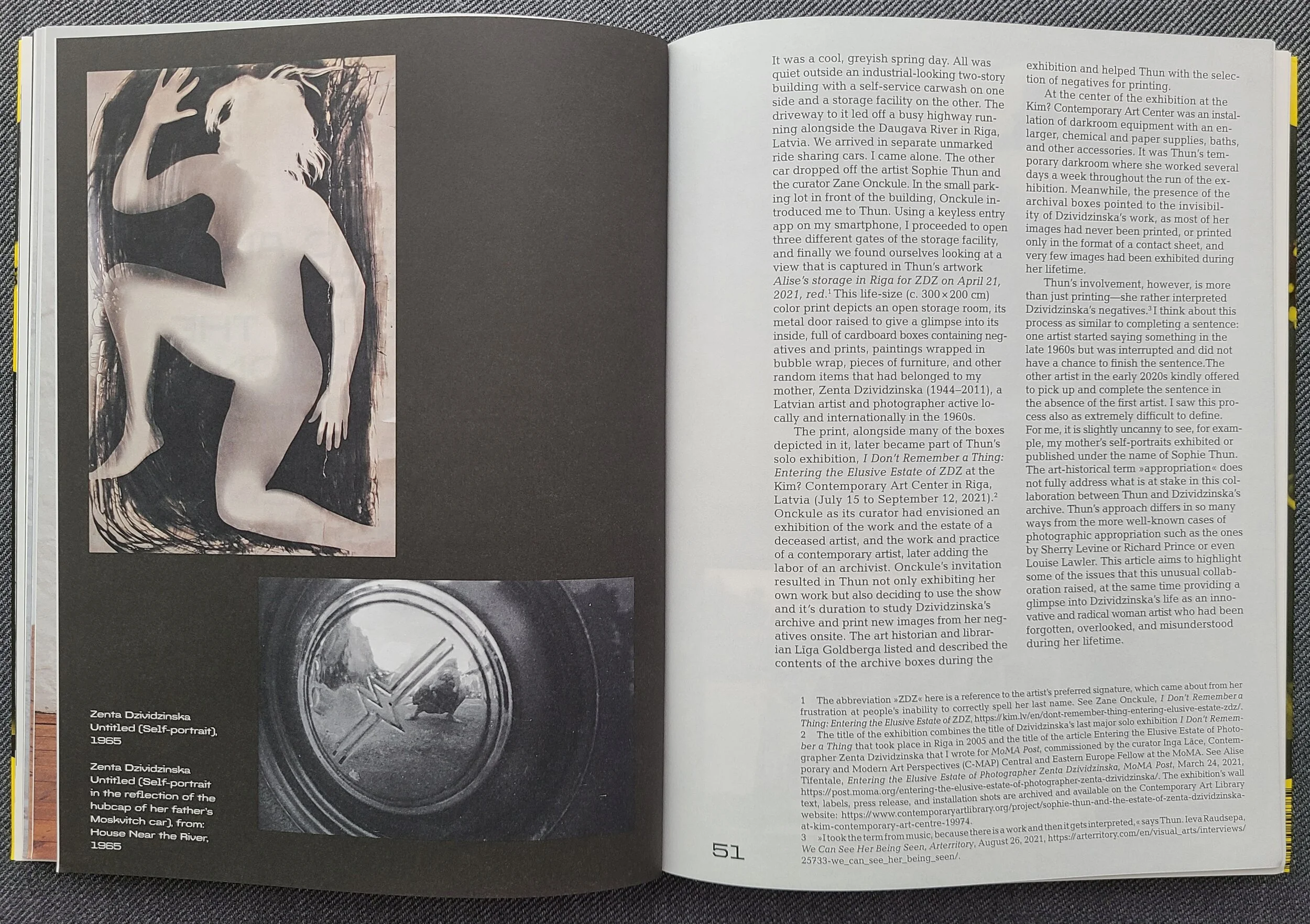 The essay was commissioned by the curator and co-editor Christin Müller for this publication. For this essay, art and photography historian Alise Tifentale revisited the collaboration between the artist Sophie Thun and the archive of the artist and photographer Zenta Dzividzinska.